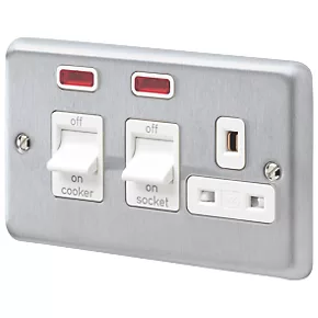 Contemporary cooker switch with additional switched socket and neon. Upward facing terminals with funnel entrance and backed-out, captive screws.