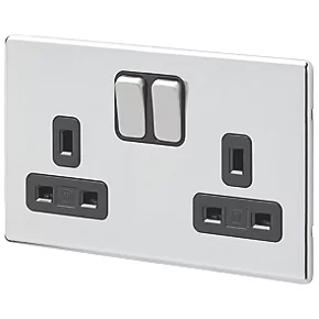 New โญ MK Aspect 13A 2-Gang DP Switched Plug Socket Polished Chrome with Black Inserts ๐