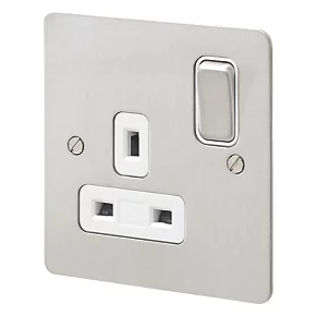 Best Sale ???? MK Edge 13A 1-Gang DP Switched Plug Socket Brushed Stainless Steel with White Inserts ✨